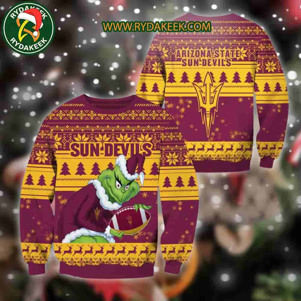 About Arizona State Sun Devils Grinch Xmas College Football NCAA Christmas Ugly Sweater for Holiday Fans By Brand Rydakeek