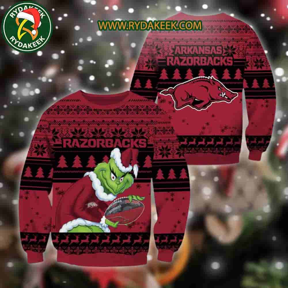 About Arkansas Razorbacks Grinch Xmas College Football NCAA Christmas Ugly Sweater for Holiday Fans By Brand Rydakeek
