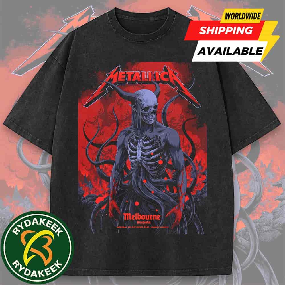 Forget the fleeting trends and sterile holiday cheer—this season, let’s celebrate the defiant spirit that truly matters. Dive headfirst into nostalgia and the thunderous cultural legacy of Metallica with this unique, vintage-style Washed Shirt Merchandise. It’s more than just fabric; it’s a wearable relic from the M72 World Tour’s electrifying stop at Marvel Stadium in Melbourne, Australia, on November 8th, 2025. The core of this shirt is the coveted, jaw-dropping design by the legendary rock artist, Ken Taylor, originally featured as an exclusive poster at the Collingwood Pop-Up Shop. Taylor’s work is deeply steeped in classic pop culture, often drawing inspiration from vintage horror movie posters and dark fantasy graphic novels, perfectly capturing the gritty, enduring aesthetic of heavy metal. For the loyal fan—the one who remembers the first time they felt the power of the “Snake Pit,” or the Gen X and Millennial devotees who find their own rebellion in every riff—this washed shirt is the ultimate badge of honor. It captures the raw energy of a truly unforgettable night, a moment shared by thousands united by pure sound. Available exclusively at Rydakeek, this piece is the ideal festive find for anyone who respects the genuine artistry and rebellious soul of rock. Skip the boring gifts; wrap up a piece of music history and let them carry the roar of Melbourne wherever they go.