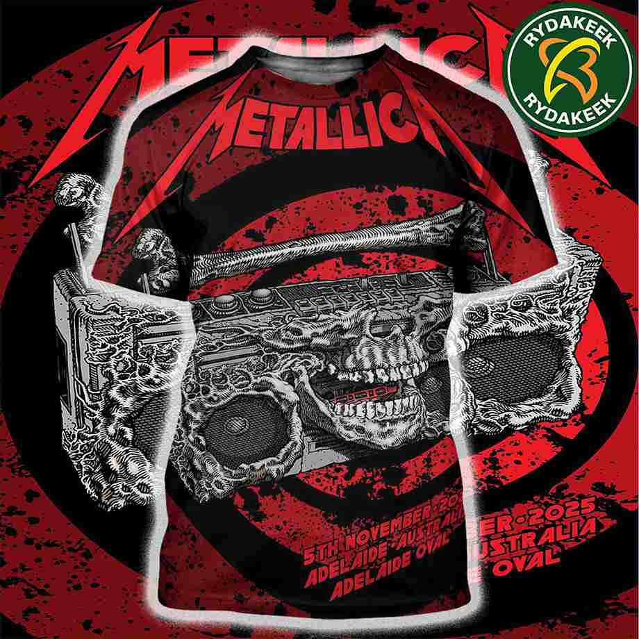 When the thunder rolls over the Adelaide Oval, it’s not just a storm—it’s the sound of history being made, the unmistakable, earth-shaking rumble of Metallica’s M72 World Tour. For the dedicated few who were there on that legendary night of November 5, 2025, or those who carry the spirit of metal in their very core, this exclusive All Over Print Shirt by Rydakeek isn’t just merchandise; it’s a battle standard, a piece of worn-in, hard-fought nostalgia. This shirt is for the loyalists, the ones who grew up tracing the iconic album art on their bedroom walls, who believe that true music is loud, raw, and relentlessly honest. The incredible artwork—dubbed the “Infernal Sound Machine”—is a masterclass in heavy metal iconography, blending the band’s signature apocalyptic energy with the raw, humorous edge often found in vintage B-movie posters and underground comics. Notice the skull-faced boombox (the very image of sonic destruction) and the fiery, electric-blue chaos—it’s a design that screams ’80s thrash energy, capturing the fierce, anti-establishment heart of the genre. Wearing this All Over Print Shirt is an immediate signal to the tribe: you respect the legacy, you appreciate the timeless power of a truly heavy riff, and you were part of the mayhem Down Under. It’s more than a tee; it’s a permanent piece of that unforgettable night.