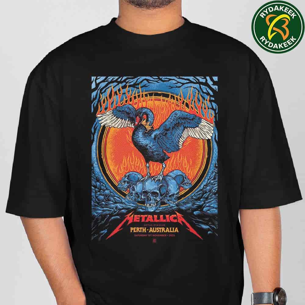 About Metallica M72 Perth Australia 2025 Black Swan of Death Poster & Merchandise Art By Ben Brown Exclusive At The Optus Stadium On November 1st T-Shirt By Brand Rydakeek