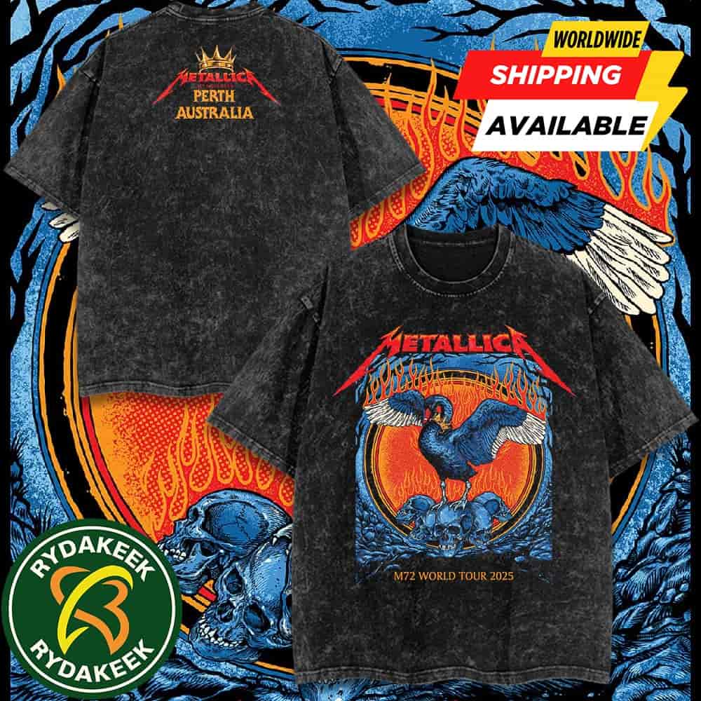 Metallica M72 Perth Australia 2025 Washed Tee Shirt captures the raw energy and sheer scale of the legendary performance at Optus Stadium on November 1st, 2025. Tailored specifically for the dedicated Gen X and Millennial loyalists—the fans who appreciate that deep-cut nostalgia of the Master of Puppets era and the rebellious spirit of the M72 World Tour—this exclusive Rydakeek piece is designed to feel like a treasured vintage find from the very start. The unique washed finish instantly transports you back, making it feel less like new merchandise and more like a shirt you’ve worn to ten shows already. The iconic artwork, “The Black Swan’s Reign,” is a masterful blend of heavy metal grit and local pop culture, inspired by the dark, compelling folklore of the Perth Black Swan—a symbol of rare, untamed power. This isn’t just concert gear; it’s a wearable relic that resonates with the human, communal spirit of rock. As the festive season approaches, this tee becomes the ultimate statement: a perfect gift or a personal victory flag that keeps the metal fire burning and honors a historical night in music.