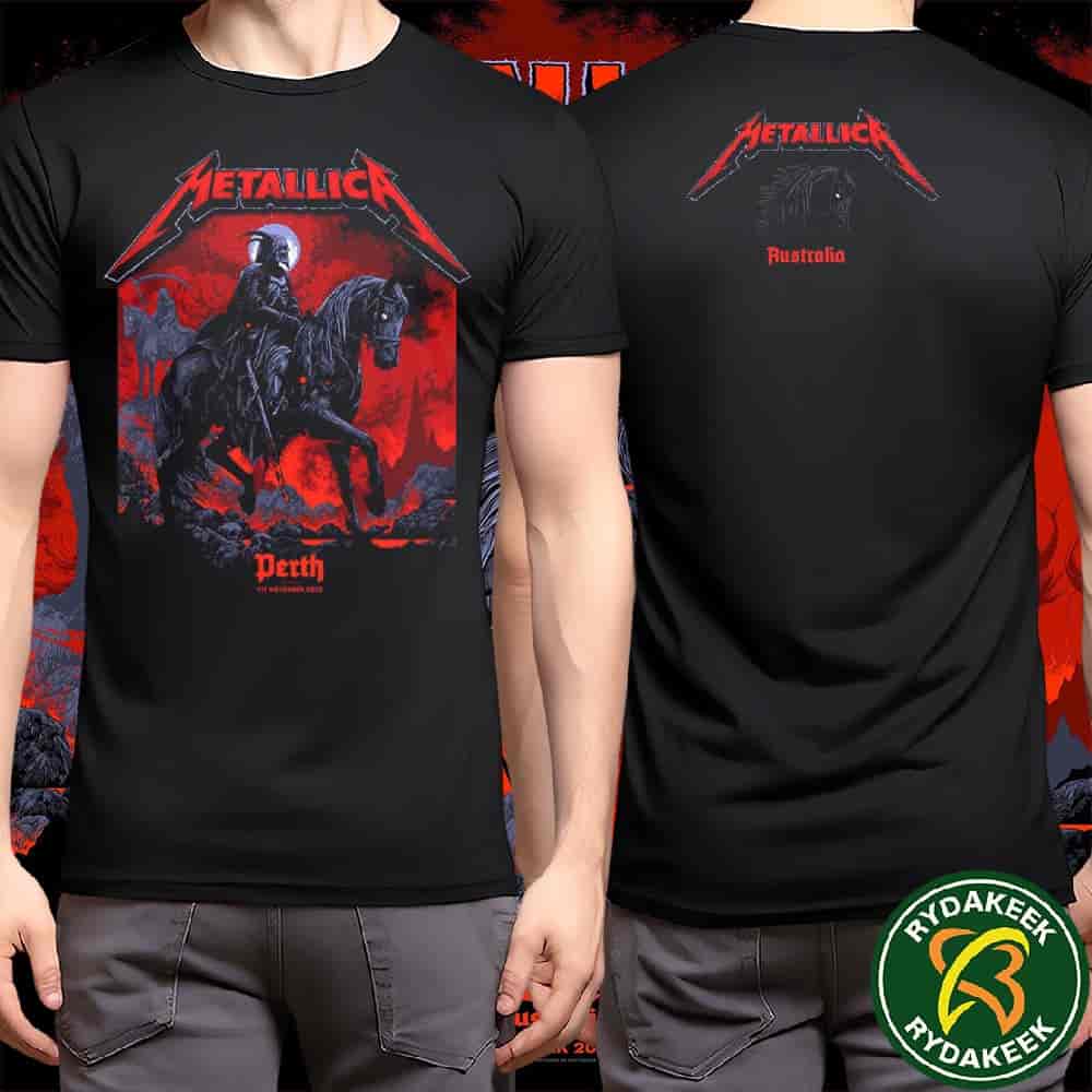 When Metallica storms into Perth, Western Australia, the energy isn’t just in the riffs—it’s in the atmosphere, the street style, and every collector’s heartbeat. The M72 Perth, Metallica Ken Taylors Exclusive Pop Up Shop Merch Tee – Pale Horseman Variant T-Shirt captures that exact spirit — a limited-edition piece of wearable history born from the raw thunder of the M72 World Tour 2025 at Optus Stadium, Burswood. This isn’t just another concert tee; it’s a visual anthem to the band’s relentless power and Perth’s electric night of metal glory. Designed by Ken Taylor, whose legendary poster art has immortalized countless rock moments, this shirt merges haunting symbolism — the “Pale Horseman” — with Metallica’s unyielding sonic mythology.
