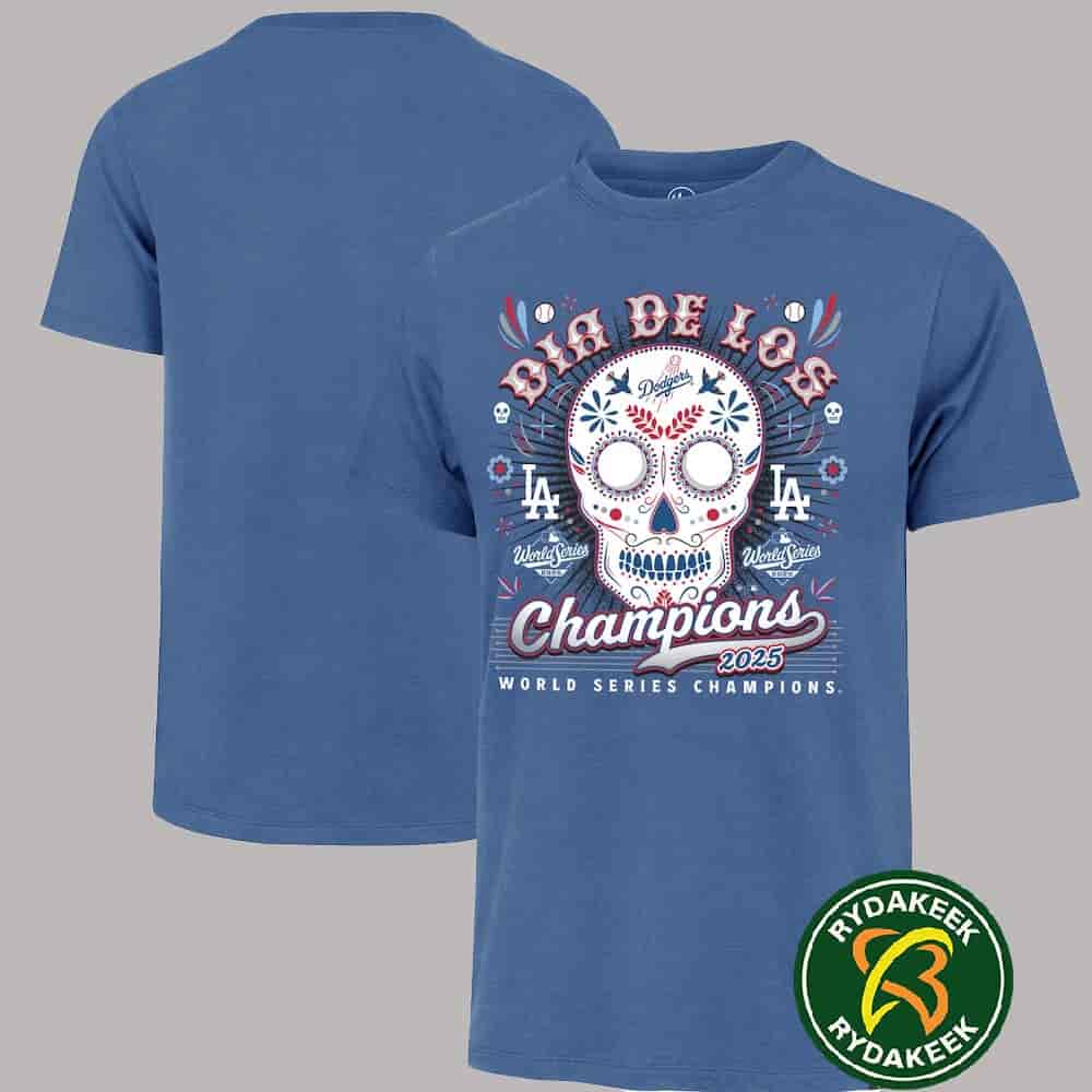 About MLB Los Angeles Dodgers MLB 2025 World Series Champions Dia De Los Champions Franklin T-Shirt By Brand Rydakeek