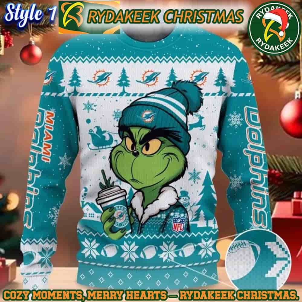 Discover more Ugly Sweater designs here:Grinch, Grinch Ugly Sweater, Miami Dolphins, Miami Dolphins Ugly Sweater