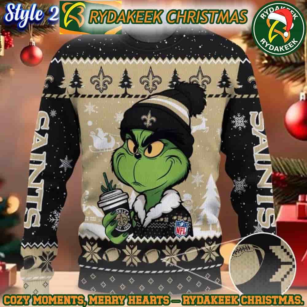 Discover more Ugly Sweater designs here:Grinch, Grinch Ugly Sweater, New Orleans Saints, New Orleans Saints Ugly Sweater