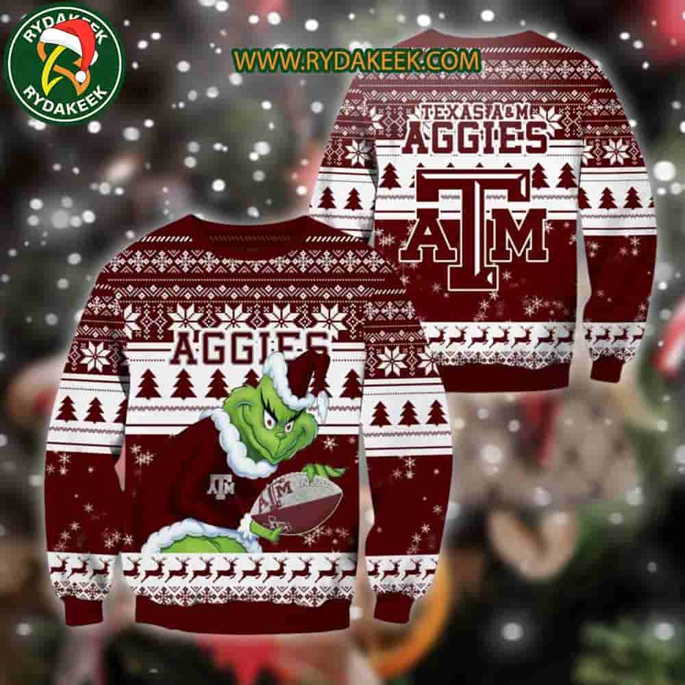 About Texas A&M Aggies Grinch Xmas College Football NCAA Christmas Ugly Sweater for Holiday Fans By Brand Rydakeek